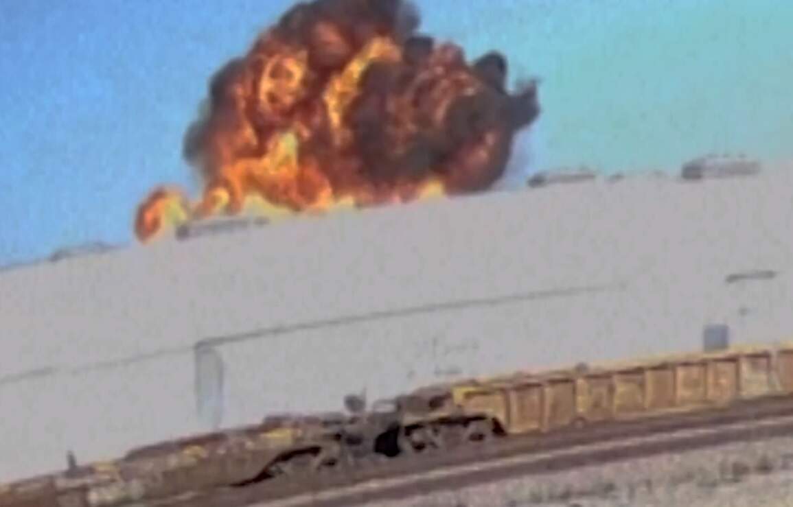 Imagens captadas por uma câmara de segurança próxima e publicadas nas redes sociais mostram o momento em que a pequena aeronave atinge o telhado de uma estrutura comercial perto de um aeroporto local, levantando uma bola de fogo e uma coluna de fumaça preta.