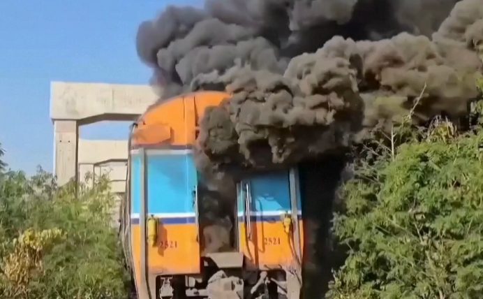 O trem, que viajava de Bangkok para a província de Ubon Ratchathani, descarrilou e pegou fogo ao ser atingido pelo guindaste no distrito de Sikhio, na província de Nakhon Ratchasima, a 230 quilômetros da capital do país.
