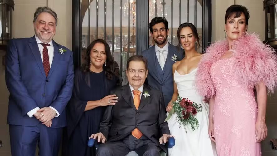 Artista plástica e mãe da única filha de Faustão, Magda surgiu elegante em um vestido rosa com bordados florais e detalhes em plumas, demonstrando sofisticação. Ela posou ao lado da noiva, do genro, Julinho Casares, apresentador e secretário municipal, e de Faustão, que acompanhou a cerimônia em cadeira de rodas, em recuperação de problemas de saúde.