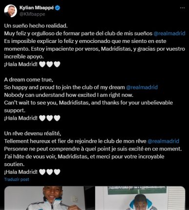 Nas redes sociais, Mbappé compartilhou imagens da infância com a camisa do clube. “Um sonho realizado. Muito feliz e orgulhoso de formar parte do clube dos meus sonhos”, escreveu o francês.