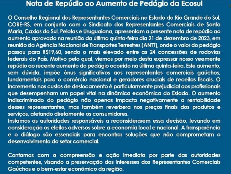 O Core-RS (Conselho Regional dos Representantes Comerciais no Estado do Rio Grande do Sul) divulgou uma nota de repúdio ao aumento da tarifa de pedágio nas rodovias administradas pela Ecosul, que passará a ser a mais cara entre todas as estradas federais concedidas à iniciativa privada no País.