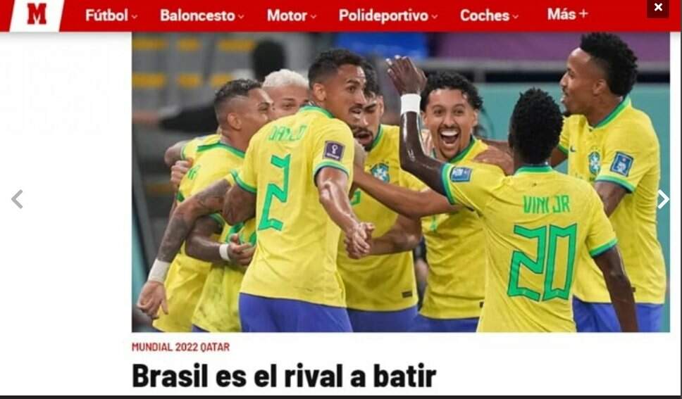 O espanhol “Marca” elogiou e criticou a Seleção Brasileira ao mesmo tempo, apesar de também descrevê-la como a tempestade no deserto do Catar. “Tudo deu certo no Brasil depois da derrapagem contra Camarões que estragou sua passagem no Catar”, escreveu o jornal. O periódico também falou que a Seleção “é rival a ser batido”.