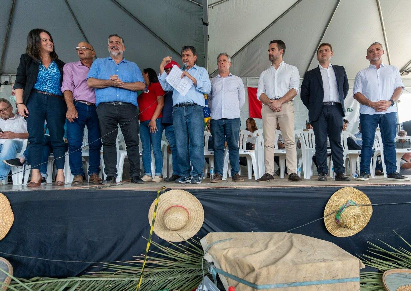 Em visita ao assentamento Copaul, em Hulha Negra, nessa quinta-feira (23), o governador Eduardo Leite e uma comitiva formada por secretários de Estado participaram de ato de anúncio de medidas da União para enfrentamento à estiagem no Rio Grande do Sul.