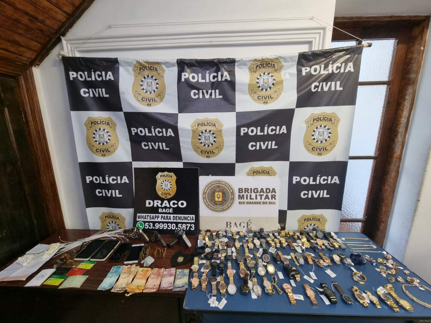 Na manhã desta sexta-feira (17), a Polícia Civil de Bagé prendeu os criminosos que praticaram o roubo em uma joalheria no centro da cidade. O crime ocorreu no começo da manhã. Três criminosos chegaram ao local vestidos com camiseta da polícia, renderam o vigilante e anunciaram o assalto. No interior da loja, os bandidos renderam outras vítimas, clientes e subtraíram relógios, joias, dinheiro e telefones celulares.