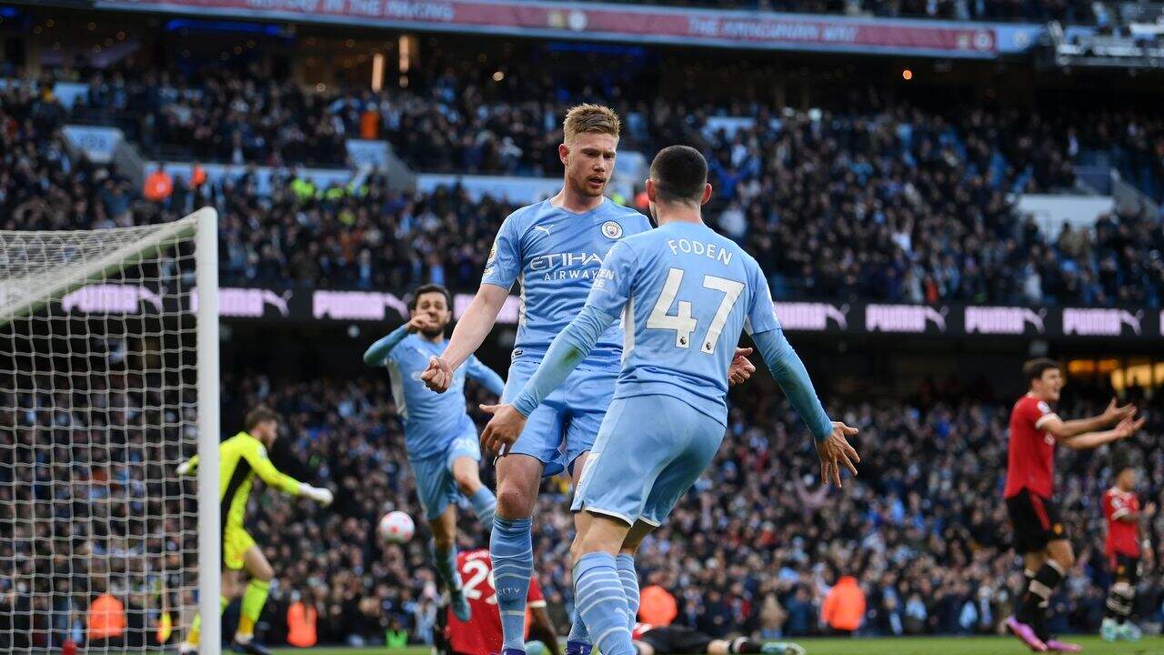 Sem Cristiano Ronaldo, lesionado, o Manchester United foi goleado por 4 a 1 pelo Manchester City, em clássico protagonizado por Kevin De Bruyne, neste domingo (6), no Etihad Stadium. A vitória, válida pela 28ª rodada do Campeonato Inglês, teve dois gols e uma assistência do astro belga, além de duas outras bolas colocadas na rede por Mahrez. O único gol da equipe de Old Trafford foi marcado por Sancho.