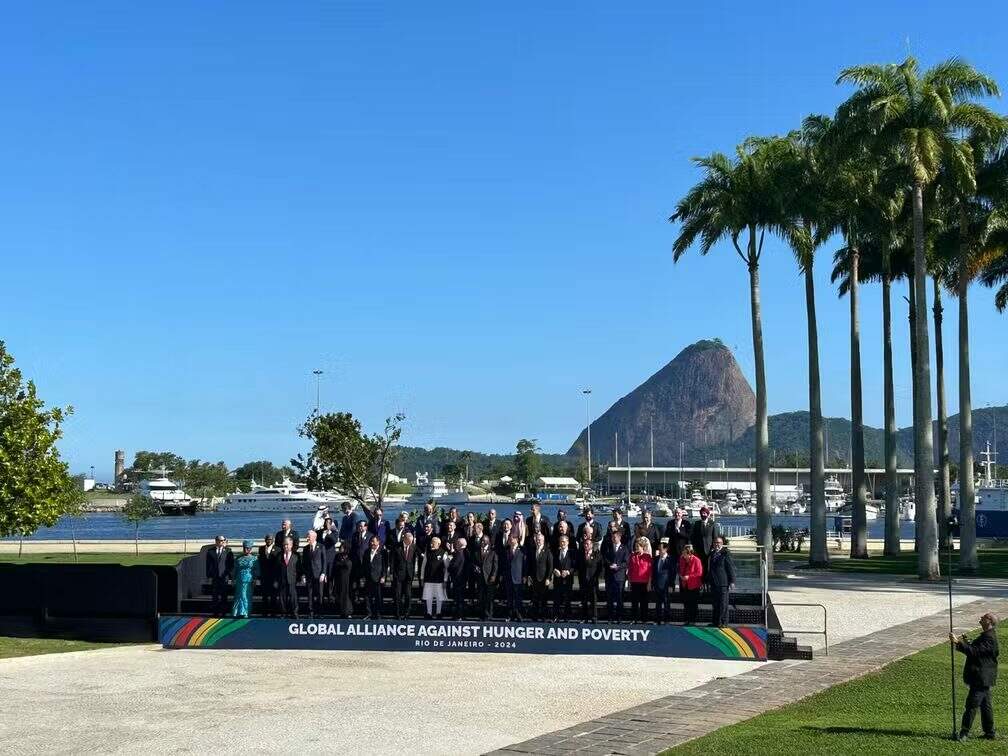 O presidente dos Estados Unidos, Joe Biden, ficou de fora da imagem. Sob o palanque duplo, um painel dizia: Aliança Global contra a Fome e a Pobreza, iniciativa do governo brasileiro referendada por todo o G20 — incluindo a Argentina, que aderiu de última hora.