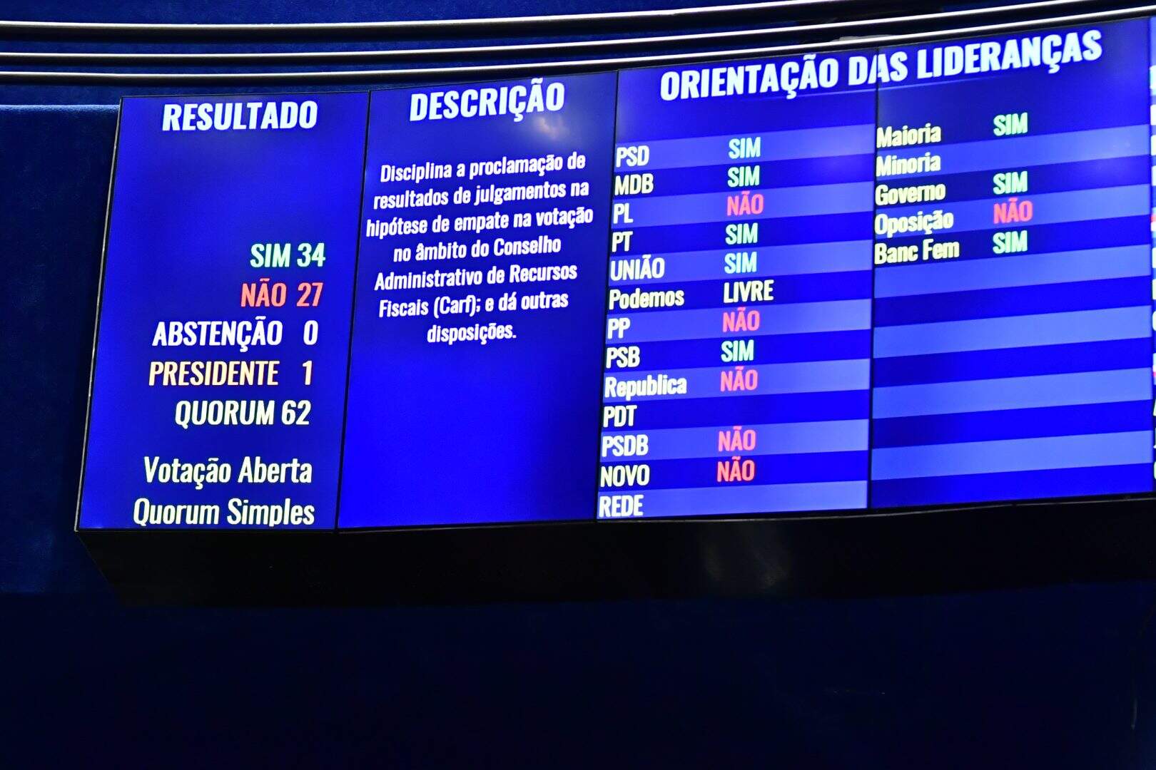 O Senado aprovou nessa quarta-feira (30), por 34 votos a 27, o projeto que retoma o voto de qualidade, a favor do governo, em caso de empate nos julgamentos do Conselho de Administração de Recursos Fiscais (Carf). O texto agora vai à sanção do presidente Luiz Inácio Lula da Silva, pois os senadores não mudaram o conteúdo da versão aprovada em julho pela Câmara dos Deputados.