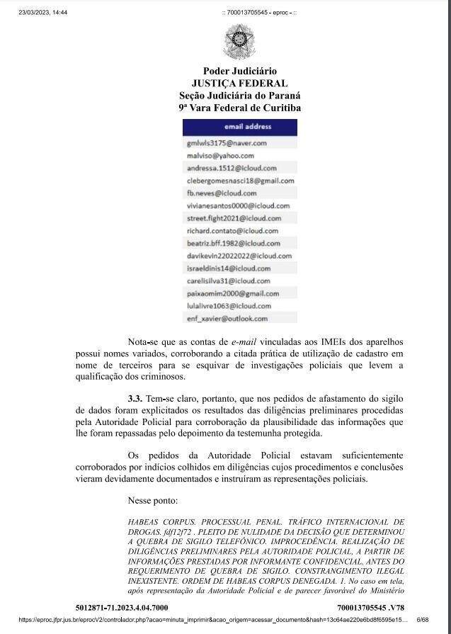 No despacho da juíza Gabriela Hardt, é possível ver os endereço de e-mail descobertos.