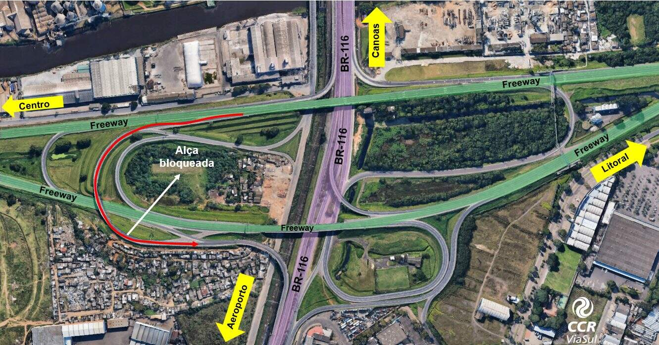 A partir das 22h desta sexta-feira (30), a CCR ViaSul, uma empresa da Motiva, realiza serviços de manutenção na alça da Freeway na região do km 92 da pista Oeste em Porto Alegre, que dá acesso ao aeroporto pela Avenida Zaida Jarros.