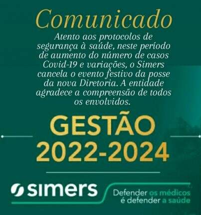 O Sindicato Médico do Rio Grande do Sul (Simers) decidiu cancelar o evento festivo de posse da nova diretoria, eleita para gestão 2022-2024. A decisão ocorre em virtude do aumento do número de casos de Covid-19 e suas variações, reforçando a necessidade de atenção aos protocolos de segurança à saúde neste período. A cerimônia estava prevista para acontecer nesta sexta-feira (07), na sede da entidade.
