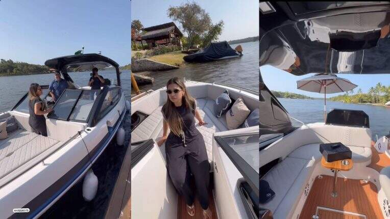 “Aqui não é qualquer barco, é personalizado. Ela escolheu a cor do banco, a cor do piso e a cor da capota”, comentou seu marido, o empresário Kaka Diniz, 39. O casal mostrou todos os detalhes do veículo que é do modelo Azov Z260 Open, da Azov Yachts.