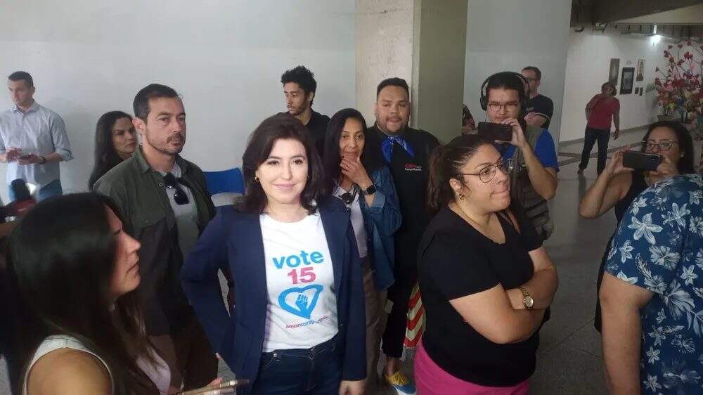 Simone Tebet chegou à zona eleitoral pouco depois das 9h, acompanhada da própria mãe e da equipe de campanha, cercada por jornalistas que tentavam registrar seu voto.