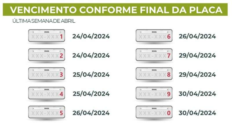 O vencimento do imposto por placas ocorre de 24 a 30 de abril, conforme cronograma estabelecido pela Receita Estadual. O contribuinte que pagar o imposto neste mês não terá desconto de antecipação, mas receberá reduções do “Bom Motorista” e do “Bom Cidadão”, caso tenha direito aos benefícios.