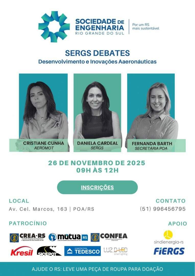 A SERGS (Sociedade de Engenharia do Rio Grande do Sul) promove, no dia 26 de novembro, o último encontro do ciclo 2025 do SERGS Debates, com o tema Desenvolvimento e Inovações Aeronáuticas. O evento será realizado das 9h às 12h, na sede social da entidade, localizada na Av. Cel Marcos, 163, bairro Pedra Redonda, em Porto Alegre.