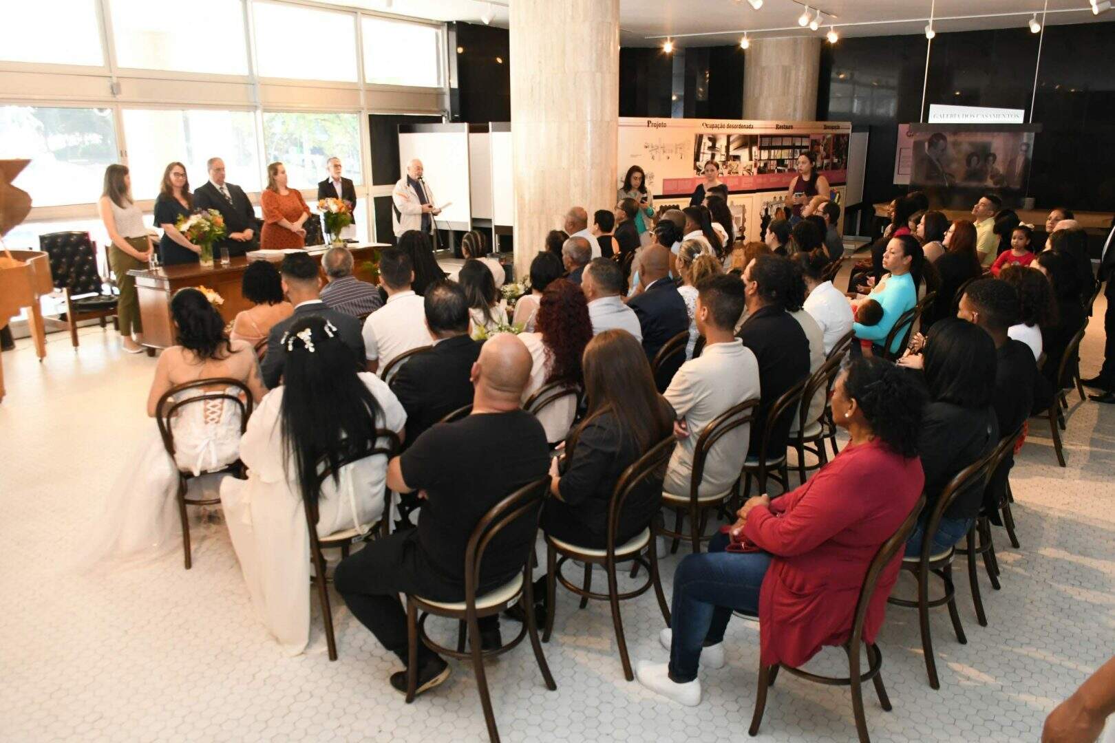 Depois, o evento foi conduzido pelo juiz de paz Raul Dias. Oferecido semestralmente para moradores da Capital que não têm condições de pagar pela documentação, o casamento coletivo não tem custos.