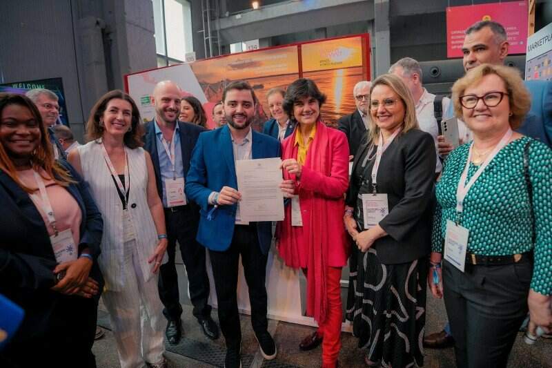 O vice-governador do RS, Gabriel Souza, e a presidente do South Summit, Maria Benjumea, anunciaram a data no estande do governo do Estado, com a presença de secretários estaduais e representantes da prefeitura de Porto Alegre.