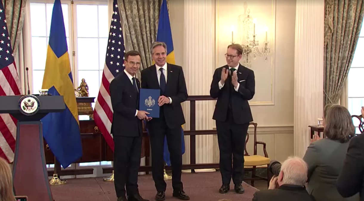 O primeiro-ministro sueco, Ulf Kristersson, entregou formalmente os documentos de adesão ao Departamento de Estado dos EUA em Washington, DC, o passo final de um processo de meses para obter a aprovação de todos os membros.