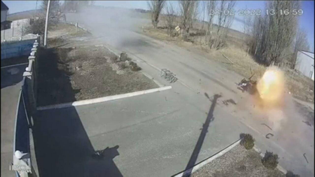 No vídeo é possível ver o momento em que o veículo trafega pela rua. O blindado russo realiza disparos na direção do carro, que para no meio da via. Logo depois ele é alvejado e duas explosões são vistas nas imagens.