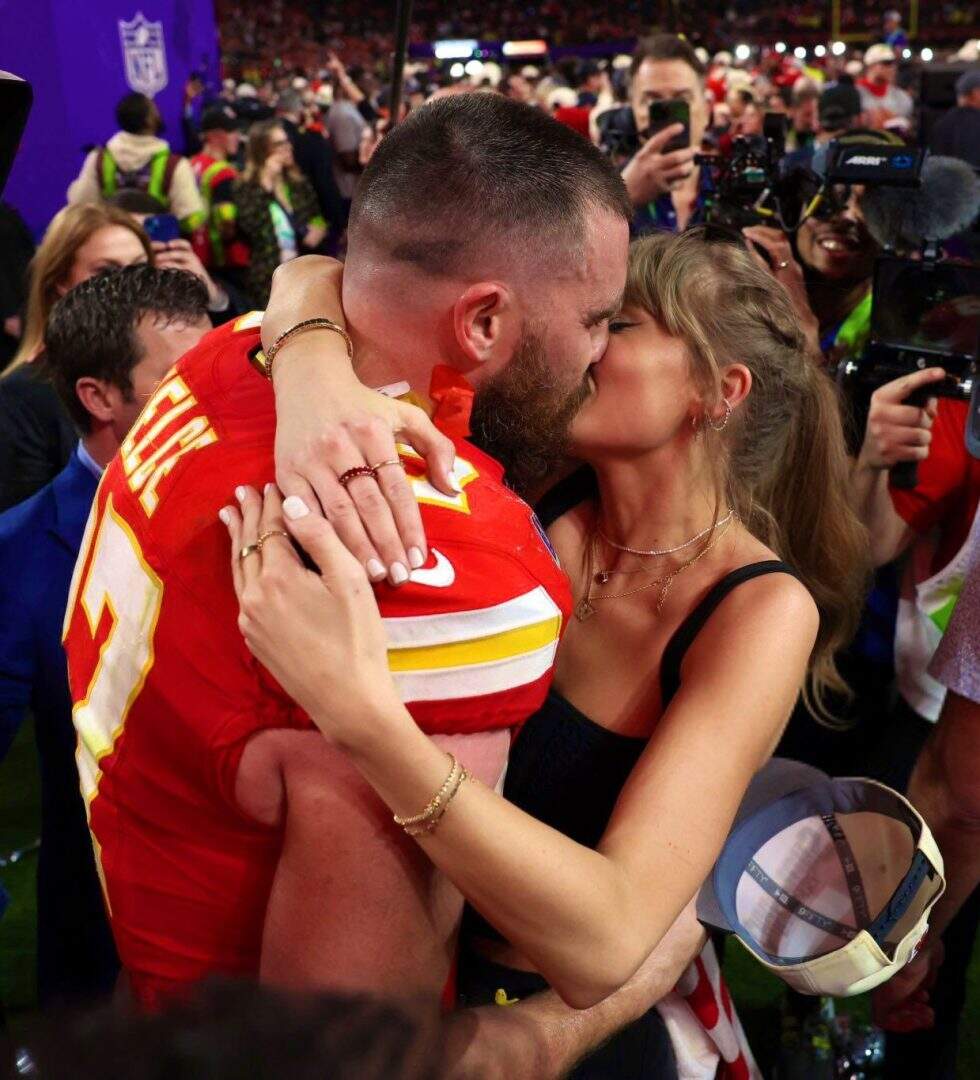 Taylor Swift beija Travis Kelce após vitória do time do namorado