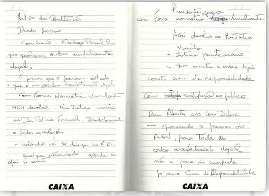 A polícia também apreendeu com o ex-ministro Augusto Heleno, que foi chefe do Gabinete de Segurança Institucional (GSI) no governo Bolsonaro, uma agenda repleta de anotações de cunho golpista e com críticas às urnas eletrônicas. Durante o seu interrogatório no dia 10 de junho, ele afirmou que a agenda não era uma “caderneta golpista” e que se tratava de documento particular.