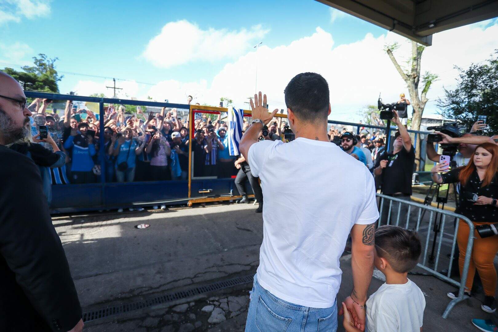 A torcida gremista se despediu do craque Suárez na manhã desta sexta-feira (8). Antes mesmo de o centroavante surgir no Aeroporto Salgado Filho, cerca de 200 tricolores vestiam máscaras representando o uruguaio.