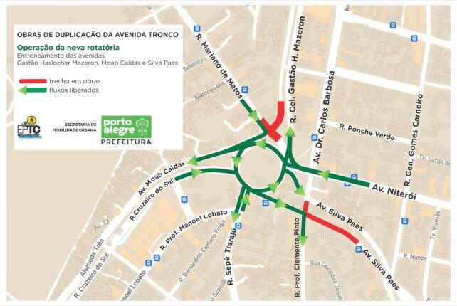 A nova rotatória no entroncamento das avenidas Gastão Haslocher Mazeron, Moab Caldas e Silva Paes, na Zona Sul de Porto Alegre, entrará em operação nesta segunda-feira (14), a partir das 9h. A estrutura viária possibilitará o avanço das obras de duplicação da avenida Tronco. Com a rotatória, haverá as seguintes alterações no trânsito: