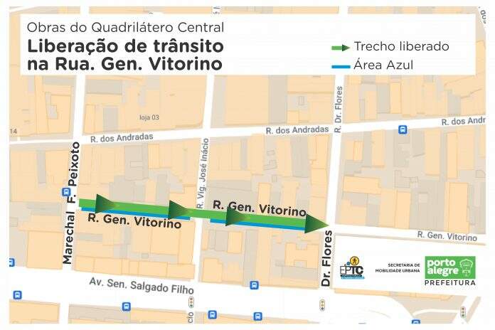 A prefeitura anuncia para esta segunda-feira (21) a liberação da rua General Vitorino para o tráfego de veículos, no trecho bloqueado entre a rua Mal. Floriano Peixoto e rua Dr. Flores, em Porto Alegre, devido a obras do Quadrilátero Central. Para o estacionamento na General Vitorino, volta a funcionar a Área Azul normalmente em apenas um lado da via.