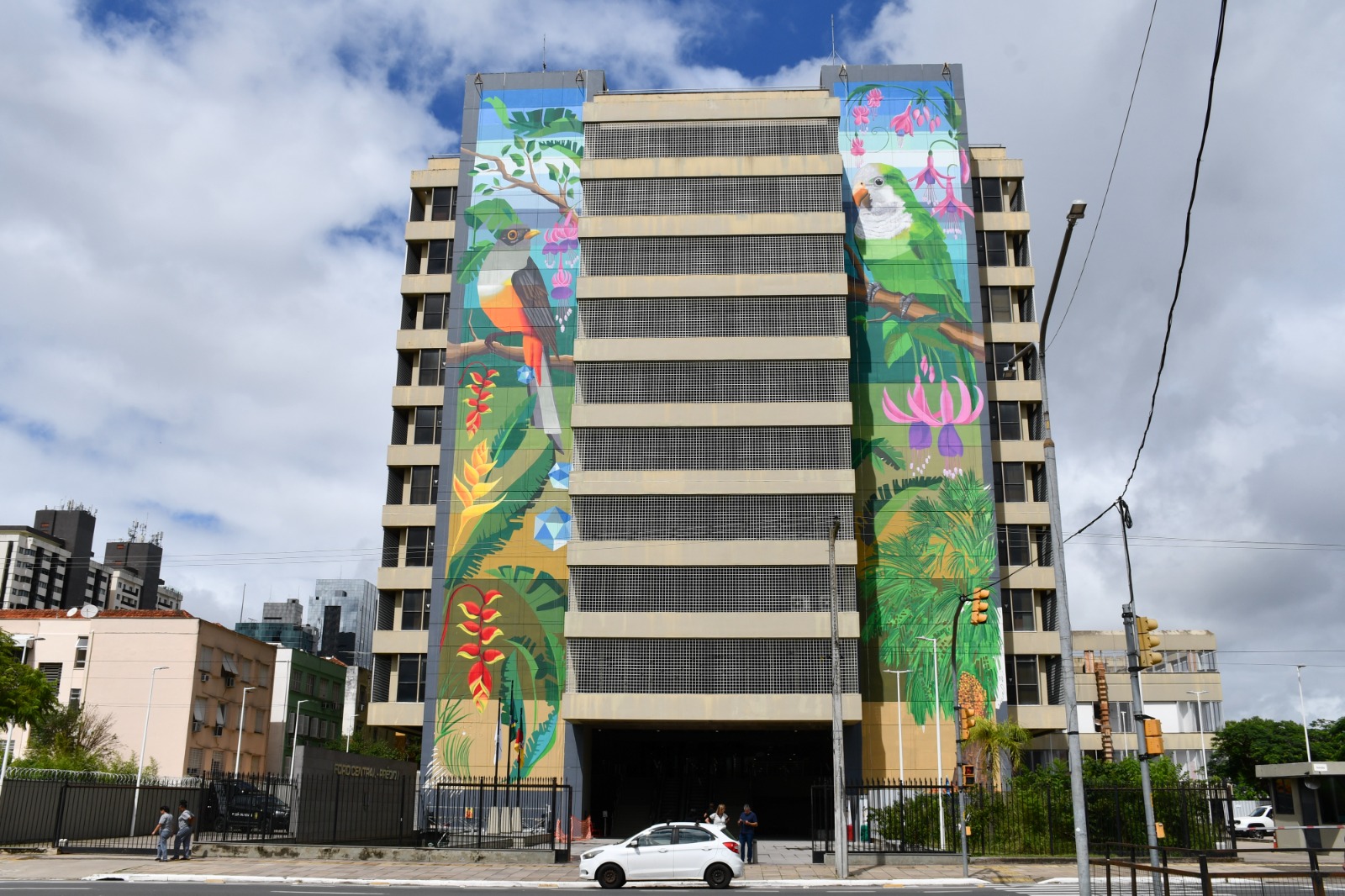As laterais do Prédio I do Foro Central de Porto Alegre receberam a obra Fauna e Flora, assinada pelo artista Tio Trampo. Cada painel mede 44,5 metros de altura por 7,7 de largura e retrata espécies emblemáticas do ecossistema gaúcho, como o sabiá-laranjeira, o periquito-verde e o brinco-de-princesa, flor símbolo do Estado.