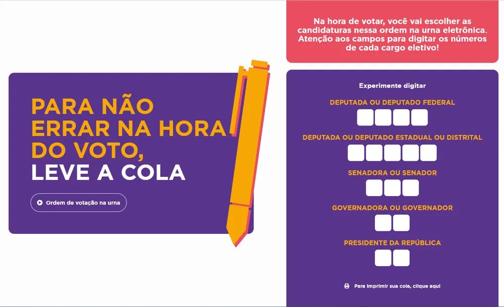 No site da Justiça Eleitoral, a ferramenta permite anotar os números dos candidatos, na ordem em que se vota. Depois, é só imprimir e levar para a cabine de votação.