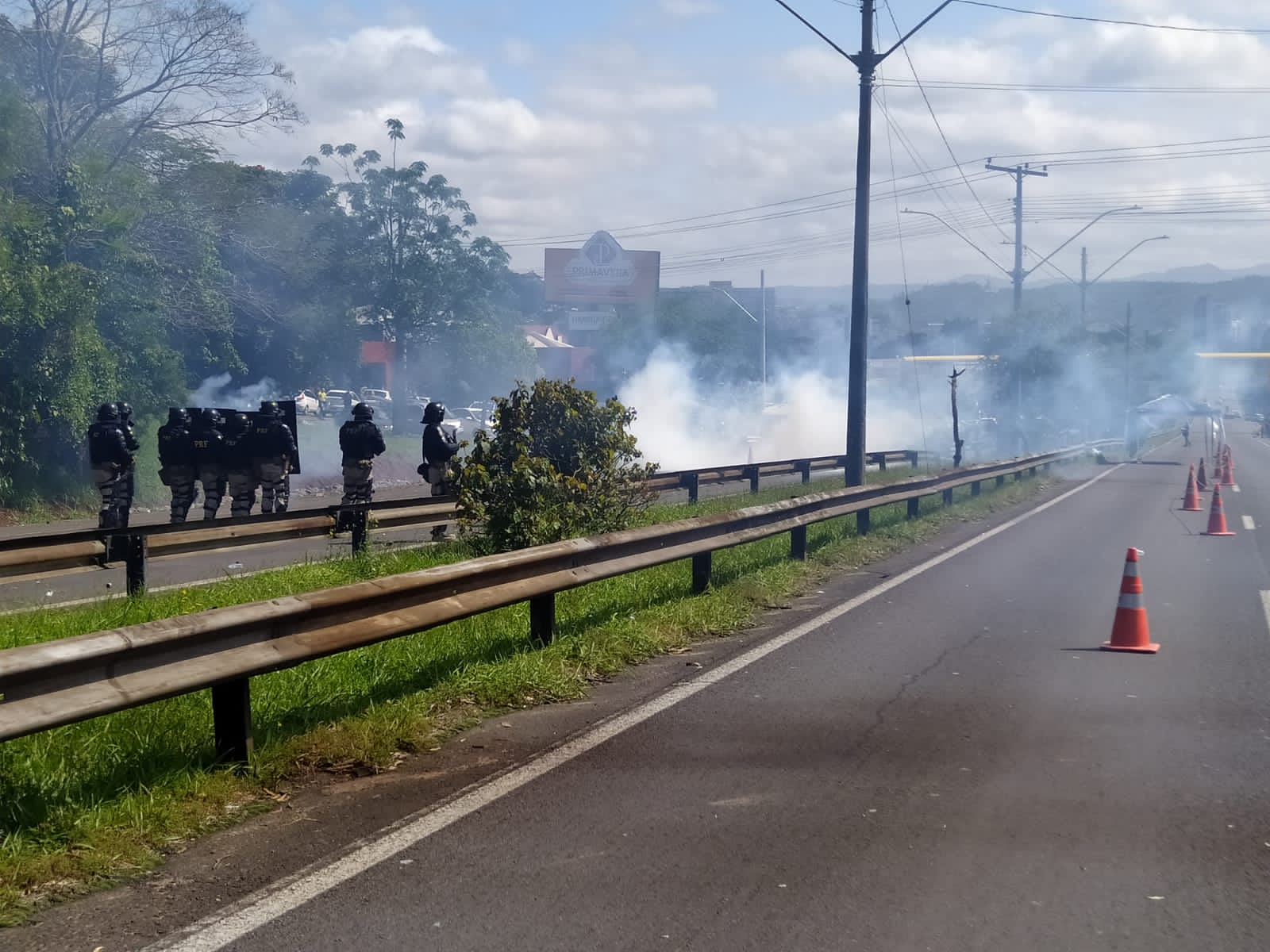 A operação da Tropa de Choque iniciou antes das 8h, com a utilização de bombas de gás lacrimogêneo e máquinas para limpar a pista. As estradas foram bloqueadas por caminhoneiros em protesto contra a vitória de Lula (PT) na eleição presidencial. Eles queimaram pneus e pedaços de madeira. Alguns pedem uma intervenção militar no País.