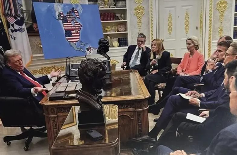 Na segunda imagem, o presidente americano aparece cercado por líderes europeus no Salão Oval, com um mapa gerado por IA no qual aparecem Canadá, Groenlândia e Venezuela como território dos Estados Unidos.