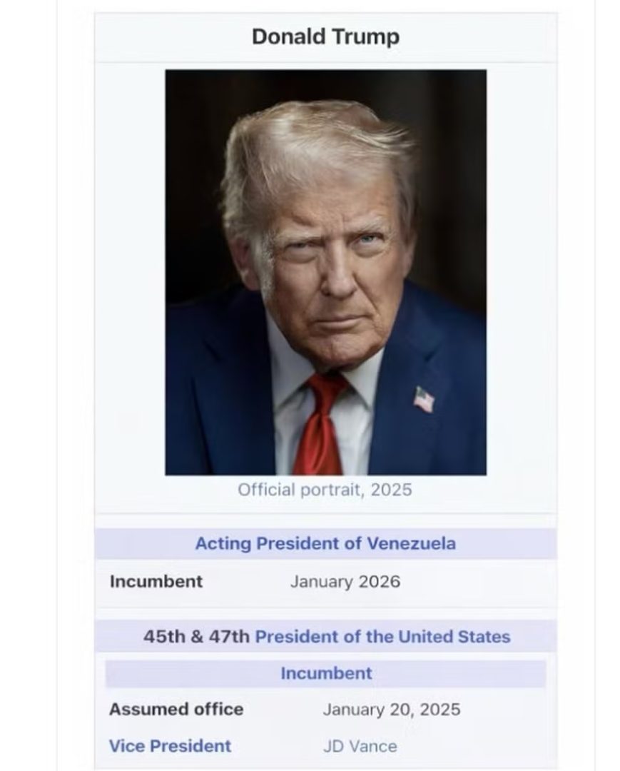 Na edição, logo após sua foto aparece a linha “presidente interino da Venezuela, em exercício, janeiro 2026”. Mais abaixo, aparece a linha que define ele como atual presidente dos EUA. No entanto, a página de Trump no site da Wikipédia não contém a parte de presidente interino da Venezuela.