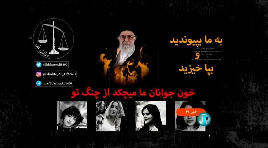 Ao lado das fotos na tela, havia uma mensagem que dizia: “Junte-se a nós e levante-se” e “O sangue de nossa juventude está pingando de suas garras”, junto com a indicação das contas nas redes sociais do grupo de hackers Edaalat-e Ali (Justiça de Ali, em português).