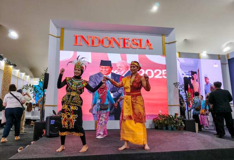 A Indonésia apostou em danças típicas e expôs o maior painel de LED da Zona Azul, com fotos recentes da visita do presidente Luiz Inácio Lula da Silva a Jacarta, abraçado e de mãos dadas com o presidente Prabowo Subianto.
