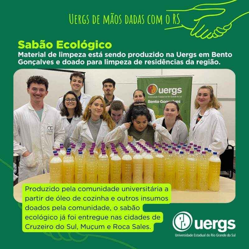 A Uergs (Universidade Estadual do Rio Grande do Sul) começou a produção de sabão ecológico no laboratório da unidade Bento Gonçalves, na Serra Gaúcha. O material será utilizado para a limpeza das residências atingidas pelo desastre climático que afeta o Estado.