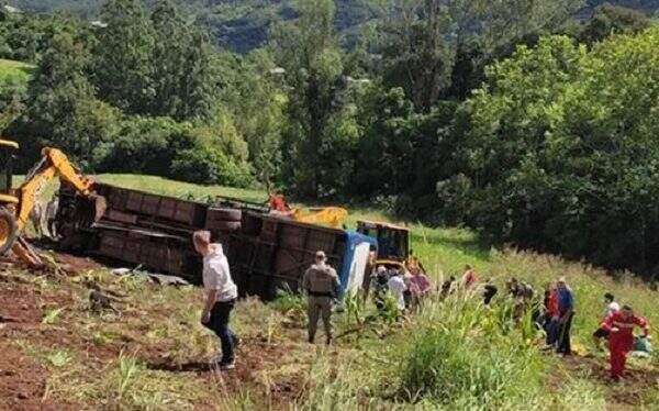 O ônibus, que transportava 33 pessoas, caiu em uma ribanceira após ter ficado sem freio na RSC-453. Vinte e seis pessoas ficaram feridas. O acidente aconteceu perto do destino final.