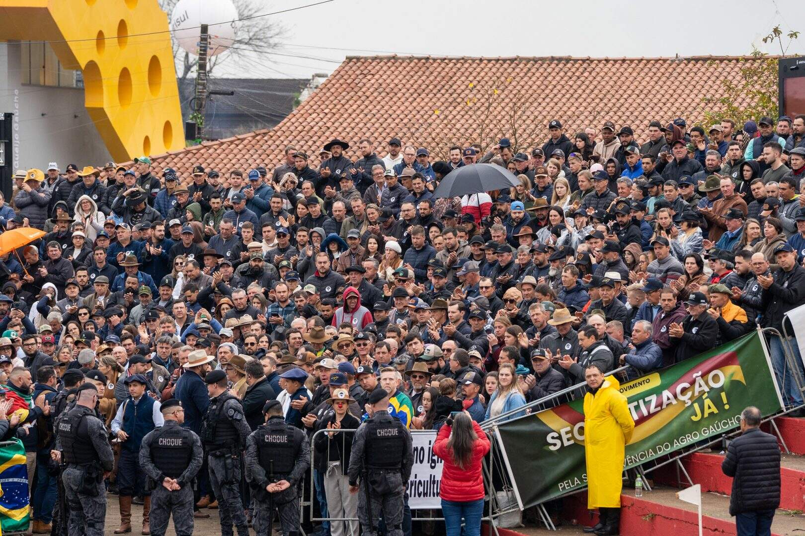 “A dor dos nossos produtores é real, mas não pode ficar ofuscada por interesses eleitorais”, disse, dirigindo-se também a representantes do governo federal presentes. Nomes da política gaúcha, como Marcel van Hattem e Luciano Zucco, estavam junto com os manifestantes naquele momento.