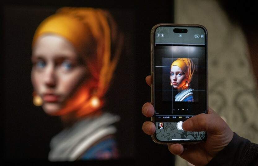 A versão é obra de inteligência artificial (IA) e faz parte de uma exposição no museu Mauritshuis de Haia, que reúne reproduções de admiradores da Moça com Brinco de Pérola, de Vermeer (1665), atualmente emprestado ao Rijksmuseum de Amsterdã para uma retrospectiva em homenagem ao pintor holandês.