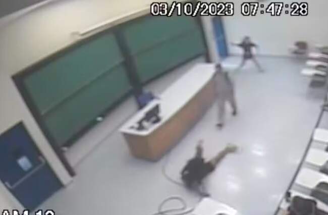 O vídeo das câmeras de segurança da sala de aula foi adicionado ao processo judicial no final de outubro de 2023. Nas imagens é possível ver o professor e o estudante entrando por uma porta lateral, já em discussão, quando o professor saca uma faca e o aluno tenta correr, caindo no chão. Na sequência, o aluno rasteja, pega uma carteira e a joga contra o professor, que vira para o lado e sai pela mesma porta que entrou.